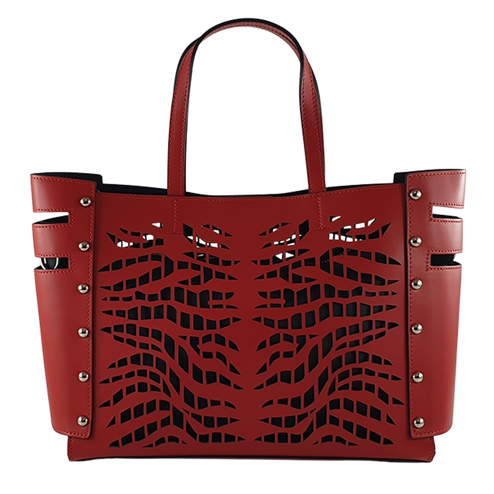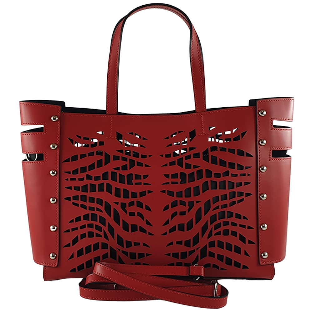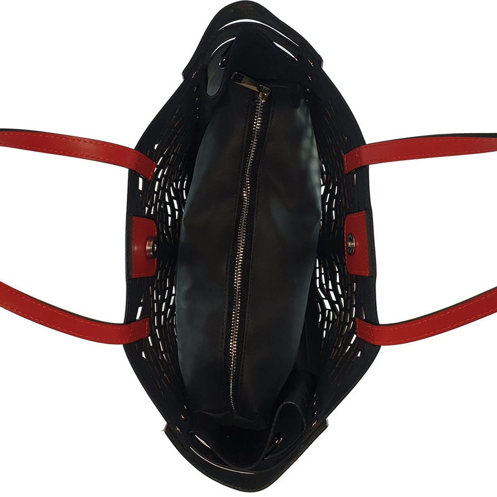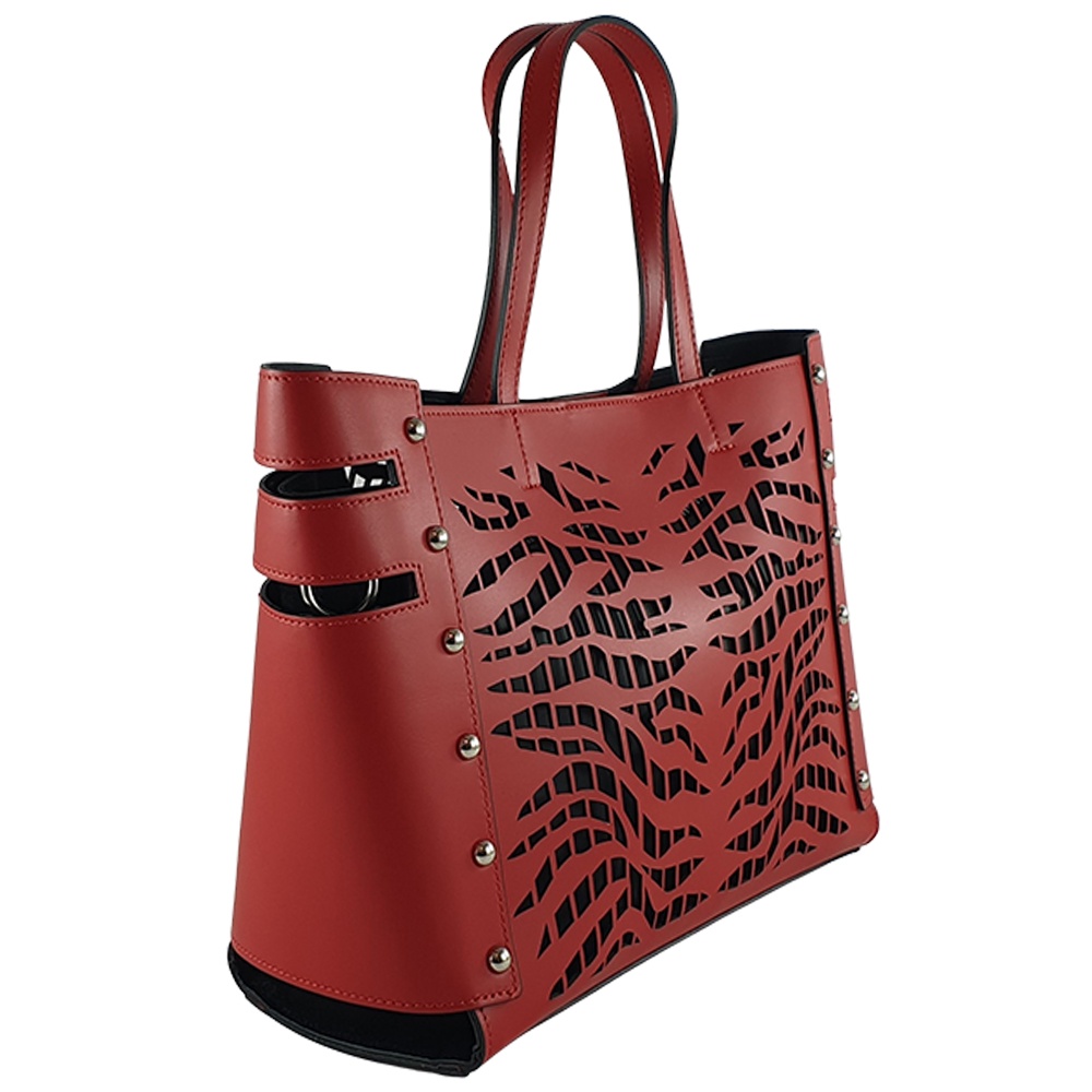 este o geanta cu aspect modern și deosebit dat de imprimeul perforat.